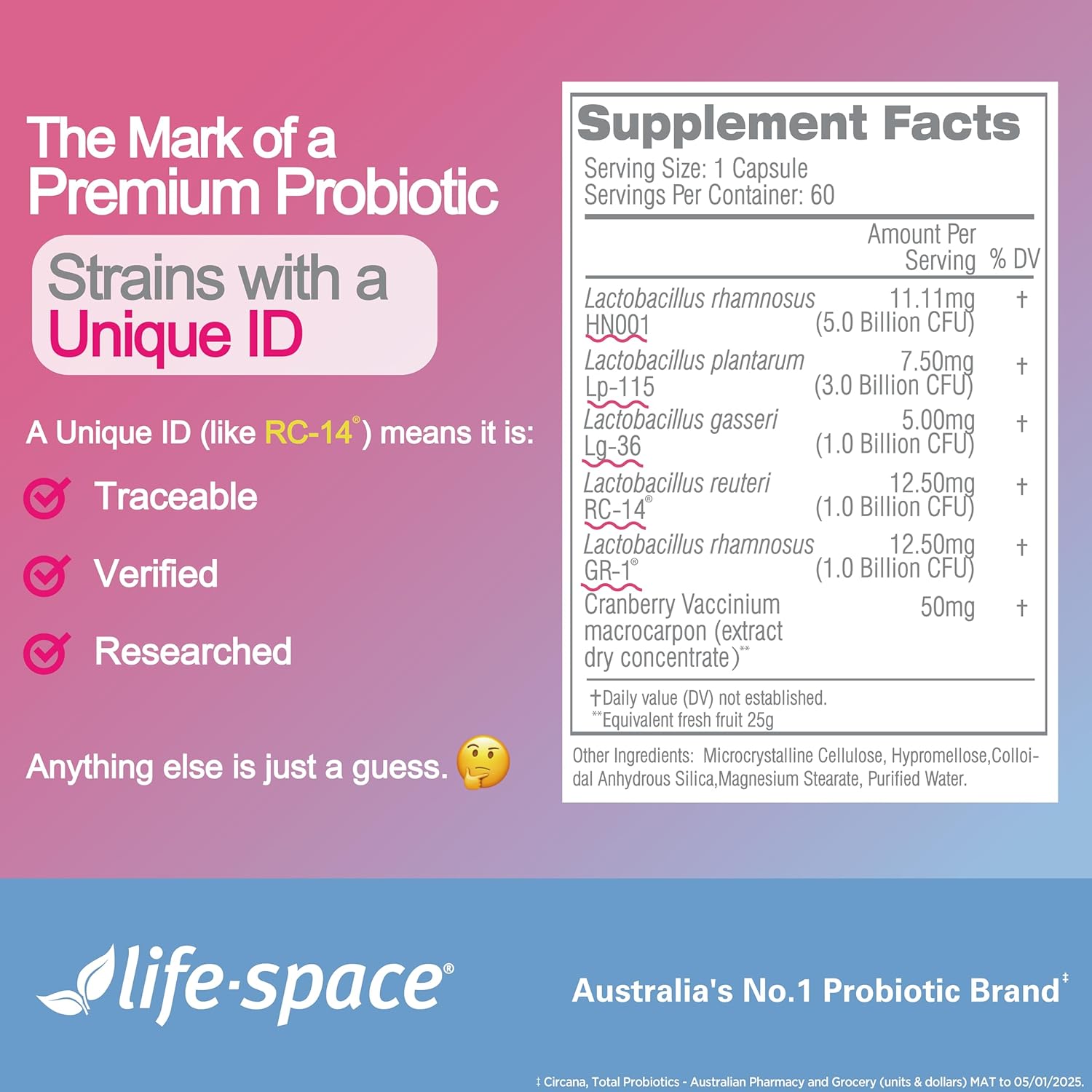 Life-Space Urogen Probiotics for Women combines probiotics and cranberry to support women's health. This product is designed to help maintain pH balance, promote urinary tract health, and support digestive and immune functions. Each bottle contains 60 capsules, providing a two-month supply. The key ingredient, Lactobacillus reuteri, is a beneficial probiotic known for its positive effects on gut health.